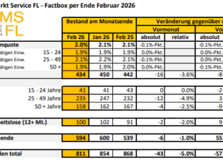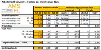 Beim Arbeitsmarkt Service Liechtenstein (AMS FL) waren Ende Februar 434 Personen arbeitslos gemeldet. Die Arbeitslosenquote verringerte sich damit von 2,1 % im Januar auf...