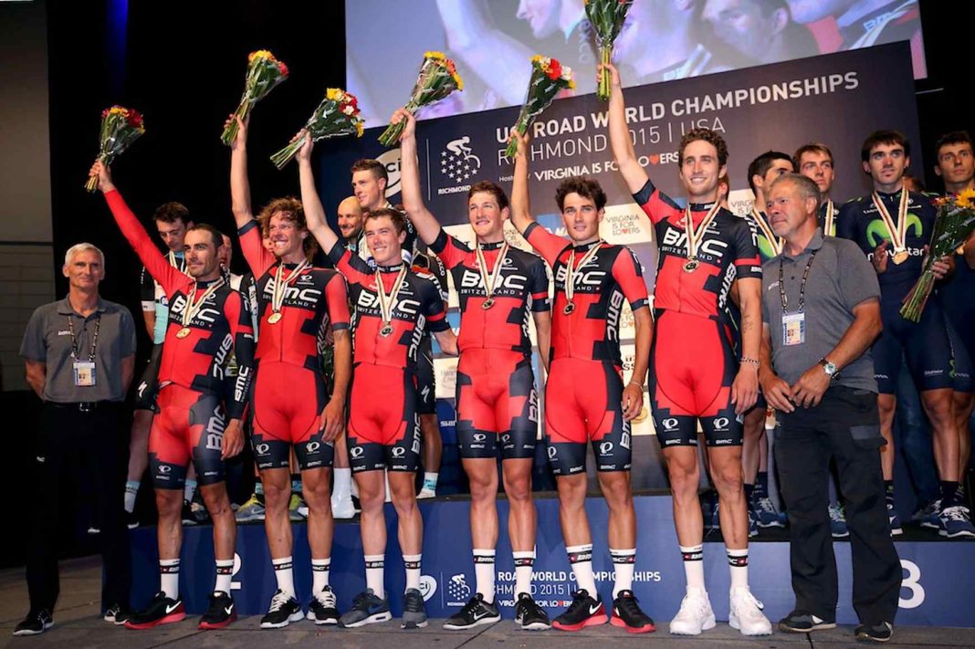 Das BMC Racing Team fuhr auf ihren BMC timemachine TM01s mit einer Druchschnittsgeschwindigkeit von 54.969 km/h durch die Strassen von Richmond, Virginia und gewann die Weltmeisterschaft im Mannschaftszeitfahren mit einem Vorsprung von 11.35 Sekunden auf Etixx-Quick Step. Movistar Team beendete das Rennen als Dritter mit 30.11 Sekunden hinter der Bestzeit von 42:07.97.