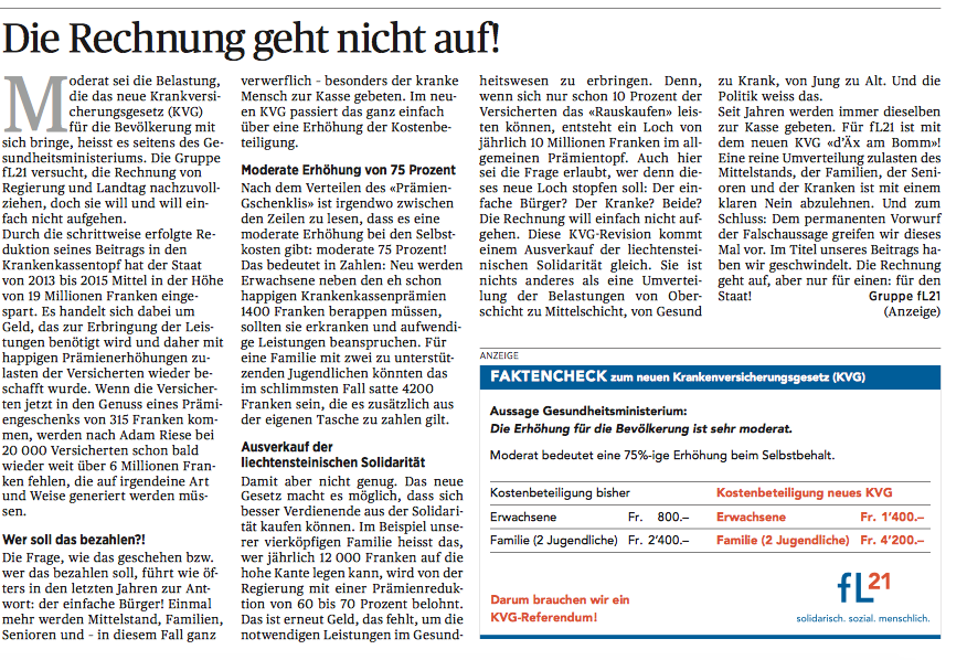 Der Forumsbeitrag vom 22. Oktober der Gruppe fL21, welche das Referendum gegen die KVG-Revision ergriffen hat, enthält Falschdarstellungen, welche einer Korrektur bedürfen. Dies schreibt die Regierung in einer Aussendung am Donnerstag. Die Situation einer Familie mit zwei Jugendlichen sei unrichtig dargestellt worden.