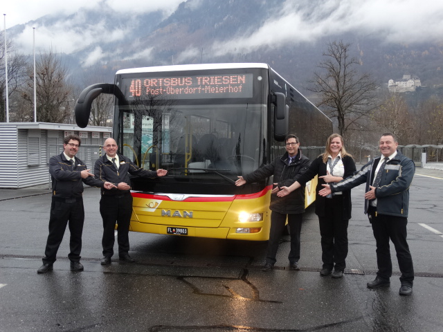 Wie bei den Schulbussen war auch bei der gewonnenen Ausschreibung für den Ortsbus Triesen das Branding nicht vorgegeben, weil diese Kosten durch die Gemeinde getragen werden. Das neue Fahrzeug MAN Lions City ist daher gelb und nimmt am 14. Dezember 2015 den Betrieb auf.