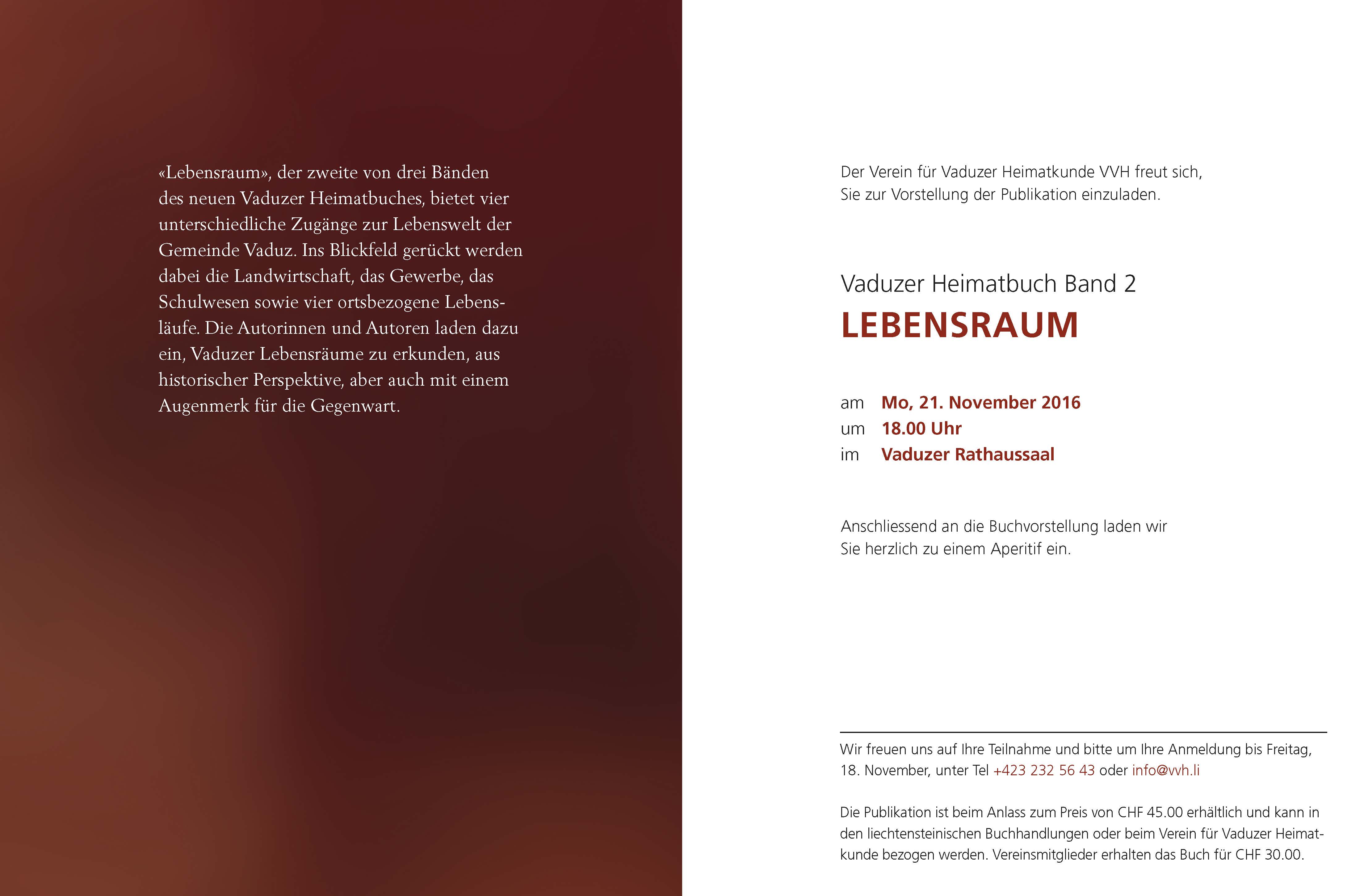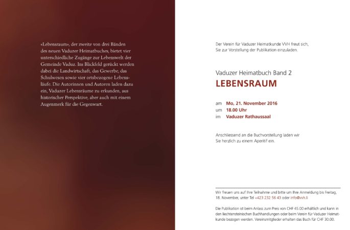 Der Verein für Vaduzer Heimatkunde VVH freut sich, den zweiten Band des Vaduzer Heimatbuches, herauszugeben. Die Vorstellung des neuen Bandes findet am Montag, 21. November 2016 um 18.00 Uhr im Vaduzer Rathaussaal statt. Interessierte sind dazu herzlich eingeladen.