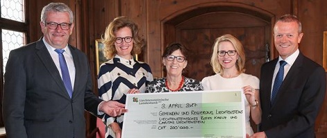 Regierungsrätin Aurelia Frick, der Vaduzer Bürgermeister Ewald Ospelt sowie der Vorsteher von Gamprin, Donath Oehri, konnten einen entsprechenden Scheck an die Präsidentin des LRK, I.K.H. Erbprinzessin Sophie von und zu Liechtenstein, sowie an die Präsidentin der Caritas Liechtenstein, Marina Kieber, überreichen.
