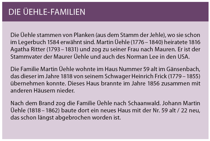 Die späteren USA-Auswanderer Josef (1822 – 1893) und Maria Üehle-Matt (1827 – 1913) wohnten im Haus Nr. 59 alt im Gänsenbach. Ihr Zuhause wurde beim grossen «Gänsenbacher-Brand» 1856 komplett zerstört. Die Familie fasste 1865 den Entschluss, in die USA auszuwandern, nachdem sie vorübergehend in Schaanwald gewohnt hatte. Mit den Kindern Josef *1852, Rosa (1853 – 1923), Maria *1859 und Johann *1862 (Todesdaten sind bis auf das von Rosa nicht bekannt) ging es auf die grosse Reise per Schiff in die Vereinigten Staaten von Amerika.