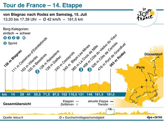 14.Etappe (181,5 km) von Blagnac nach Rodez mit kurzem aber steilem Schlussanstieg