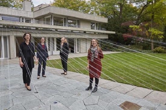 Beate Frommelts Werk spielt mit Licht und Schatten, aber auch mit der konkreten Architektur und Natur, welche sie am jeweiligen Ort vorfindet. Mit den feinen Polyesterfäden, die den Raum durchmessen, tauchte sie die Räumlichkeiten und Umgebung der liechtensteinischen Botschaft in eine neue Atmosphäre.