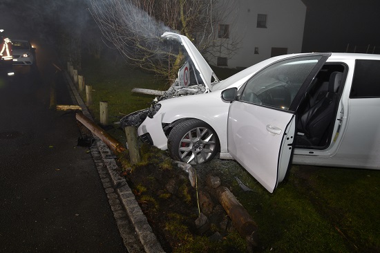 Ein mit vier Personen besetzter liechtensteinischer Personenwagen war um ca. 23:45 Uhr auf der ‚Binzastrasse‘ in Mauren bei dichtem Nebel und mit übersetzter Geschwindigkeit in nordöstliche Richtung gefahren. Im Verzweigungsbereich zur ‚Pfandbrunnen‘-Strasse bremste der Lenker sein Fahrzeug stark ab, wobei es auf der nassen und teilweise gefrorenen Strasse ins Rutschen geriet und folglich mit einem Holzzaun und einer Strassenlaterne kollidierte. Das durch den Aufprall in Brand geratene Fahrzeug musste durch die Feuerwehr Mauren gelöscht werden.