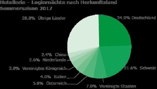 In der Sommersaison 2017 erreichten die Gäste mit dem Herkunftsland (Wohnsitzstaat) Deutschland einen Anteil von 24.9% an den gesamten Logiernächten in der Hotellerie. Die Gäste aus Deutschland verbrachten 16’888 Nächte in Liechtenstein.