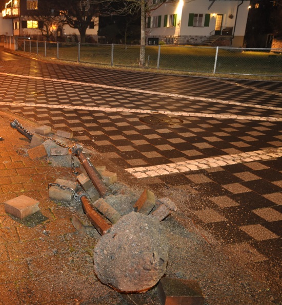 Am Freitag 22.12.2017, um ca. 18:40 Uhr, fuhr ein Autolenker, in alkoholisiertem Zustand, auf der ‚Kirchstrasse‘ in Vaduz in Richtung Westen. Dabei kollidierte er auf Höhe der Verzweigung ‚Am schrägen Weg‘ gegen drei mittels Ketten verbundenen Eisenpfosten.