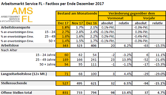 Vaduz – Gemäss den Erhebungen des Arbeitsmarkt Service Liechtenstein (AMS FL) waren Ende Dezember 343 Arbeitslose beim AMS FL gemeldet, 20 Personen mehr als im Vormonat. Die Arbeitslosenquote erhöhte sich damit von 1,7 Prozent im November 2017 auf 1,8 Prozent im Berichtsmonat. Gegenüber dem Vorjahresmonat verringerte sich die Arbeitslosigkeit um 63 Personen. Die Arbeitslosenquote sank gegenüber dem Vorjahresmonat um 0,3 Prozentpunkte.