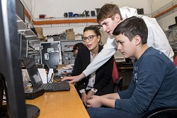 Bildlegende Foto 2: Foto von links: Bildungsministerin Dominique Gantenbein, Dimitri und Adriano betätigen sich im Rahmen der BerufsCHECK-Woche als Telematiker/-in. Quelle: IKR/Michael Zanghellini