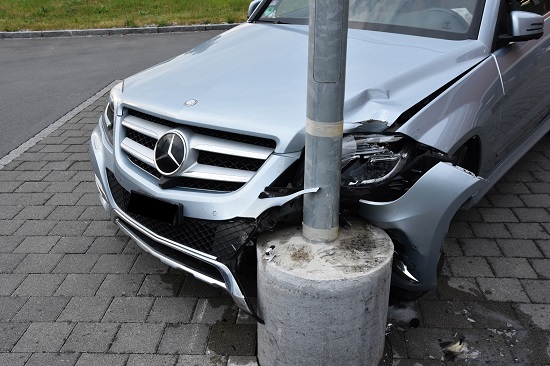 Gegen 19:00 Uhr fuhr eine Autolenkerin auf dem Parkplatz eines Einkaufzentrums auf dem vorgegebenen Fahrbahnverlauf in Richtung Ausfahrt. Bei der letzten Abzweigung bog sie zu früh links ab und kollidierte mit einem sich dort befindlichen Lichtmasten. Die Frau verletzte sich im Bereich des Oberkörpers. Am Fahrzeug entstand erheblicher Sachschaden.