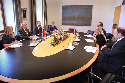 Auf der Agenda stand anschliessend eine Besichtigung des Landtagsgebäudes, wo die Gäste die aussergewöhnliche Architektur bewundern konnten. Danach begab sich die Delegation zum Mittagessen, bei welchem die Themen des Arbeitsgespräches weiter vertieft wurden.