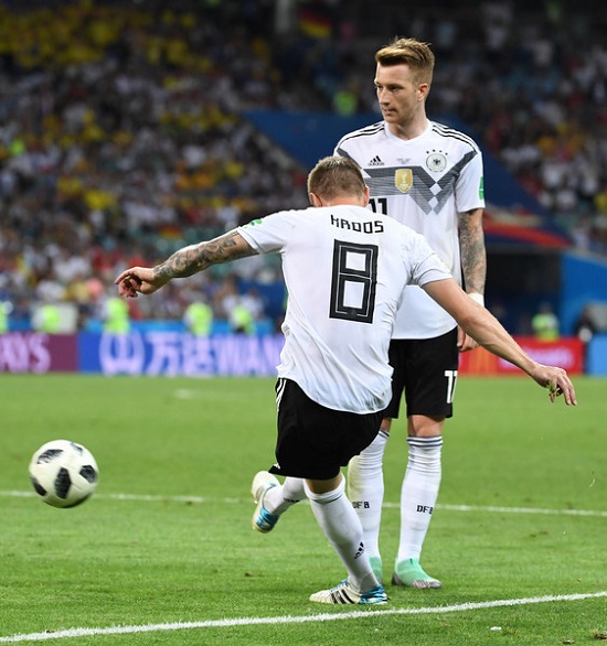 Zuvor gingen aber die Schweden nach einem katastrophalen Fehlzuspiel Kroos durch Toivonen 0:1 in Führung, die Reus in der 48.min.ausglich. In Unterzahl kamen dann die Deutschen durch den Real-Madrid-Spieler Toni Kroos kurz vor Spielende zum verdienten 2:1-Erfolg über Schweden, die aber auch noch nicht aus dem Rennen sind.