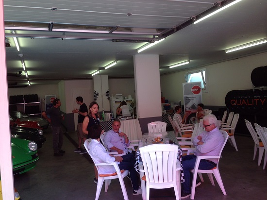 Neben ausreichender Verpflegung bietet sich den Gästen die Möglichkeit zu einem small-talk in der hübsch eingerichteten Garage. Dort ziehen einige Porsche älteren Jahrgangs das Interesse der Besucher auf sich. Blick in die Ausstellungshalle, die kurzfristig in ein Café umgewandelt wurde. Die Veranstaltung dauert noch bis 17 Uhr. Alle sind herzlich eingeladen.