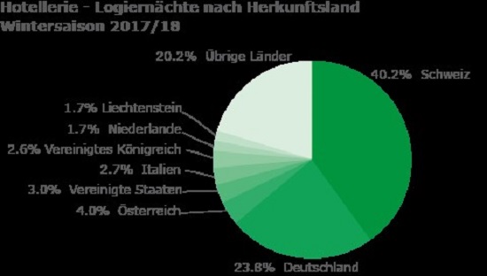 In der Wintersaison 2017/18 erreichten die Gäste mit dem Herkunftsland (Wohnsitzstaat) Schweiz einen Anteil von 40.2% an den gesamten Logiernächten in der Hotellerie. Die Gäste aus der Schweiz verbrachten 25‘643 Nächte in Liechtenstein.