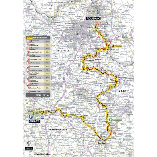 Es ist aber auch der Tag, den Klassikspezialisten lieben und die Bergfahrer verfluchen. Die q5 Passagen werden rückwärts gezählt. Den Anfang macht nach 47,5 km der Sektor Escaudoeuvres à Thun (1600 Meter) und dann folgen die nächsten Sektoren in regemässigen Abständen u.a. auch die durch Paris-Roubaix berühmten Brillon (km 87., 2000 Meter lang), Orchies (km 96. 1400), Mons-en-Pévève (km 110.,900) oder Willems à Hem (km 148., 1400). Vom letzten Pavé sind es noch 5,5 km bis zum Ziel in Roubaix.