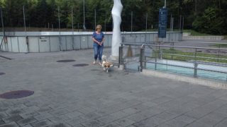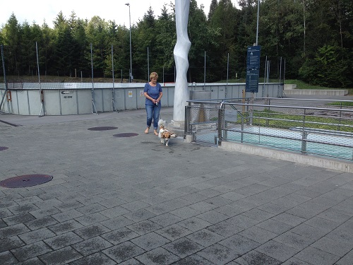 Wer sich abkühlen möchte, der sucht das Becken beim neuen Sporthaus auf. So wie diese Frau mit dem kleinen Hund, den es ebenfalls freut, sich in Gottes freier Natur bewegen zu können.