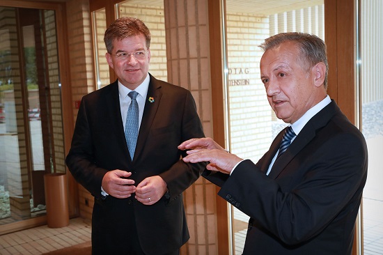 Miroslav Lajčák, Präsident der UNO-Generalversammlung und Landtagspräsident Albert Frick bei der Begrüssung im Landtagsgebäude. Quelle: IKR