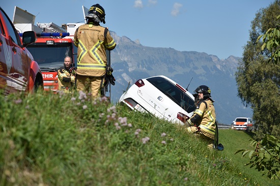 Ein Fahrzeuglenker fuhr um ca. 12 Uhr mit seinem Personenwagen von Triesen kommend auf dem Rheindamm in Richtung Rheinbrücke. Aufgrund des entgegenkommenden Verkehrs fuhr er mit seinem Fahrzeug auf einen Ausweichplatz am rechten Strassenrand. Um eine Kollision mit sich dort bereits befindlichen Fahrzeugen zu vermeiden, bremste er sein Fahrzeug ab und lenkte es an den anderen Fahrzeugen vorbei auf die landseitige Dammböschung hinunter. Das Fahrzeug kam in Schräglage zu stehen.