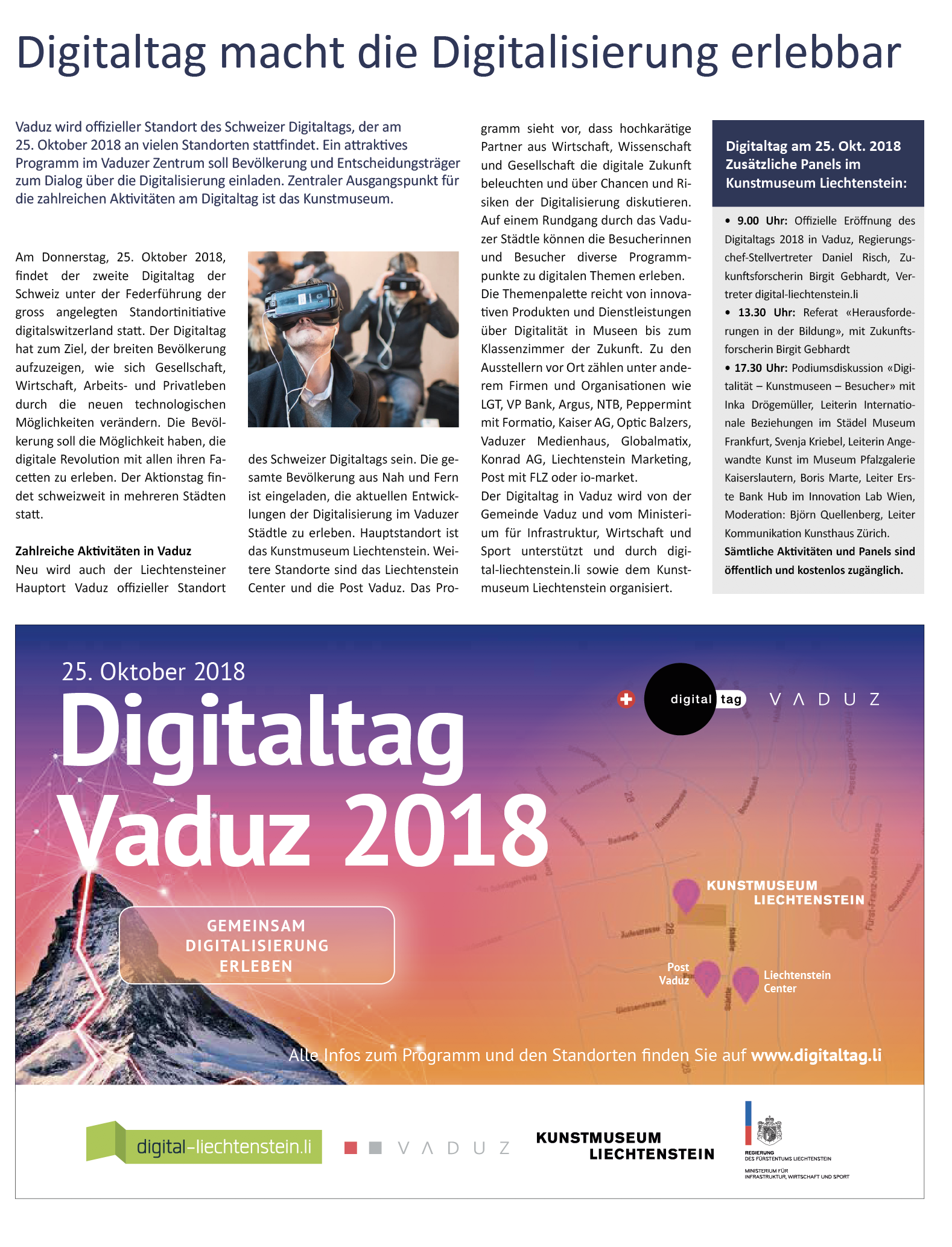 Nächster Meilenstein der Initiative ist der Digitaltag am 25. Oktober, wobei Vaduz erstmals als offizieller Standort des Schweizer Digitaltags fungiert. Die Partner von digital-liechtenstein.li präsentieren im Kunstmuseum Liechtenstein sowie an weiteren Standorten im Vaduzer Städtle digitale Innovationen und Trends aus Liechtenstein. Sämtliche Aktivitäten am Digitaltag in Vaduz sind kostenlos und öffentlich zugänglich.