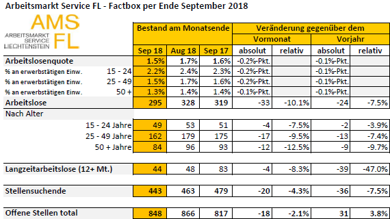 Gemäss den Erhebungen des Arbeitsmarkt Service Liechtenstein (AMS FL) waren Ende September 295 Arbeitslose beim AMS FL gemeldet, 33 Personen weniger als im Vormonat. Die Arbeitslosenquote verringerte sich damit von 1,7 Prozent im August 2018 auf 1,5 Prozent im Berichtsmonat. Gegenüber dem Vorjahresmonat verringerte sich die Arbeitslosigkeit um 24 Personen. Die Arbeitslosenquote sank gegenüber dem Vorjahresmonat um 0,1 Prozentpunkte.