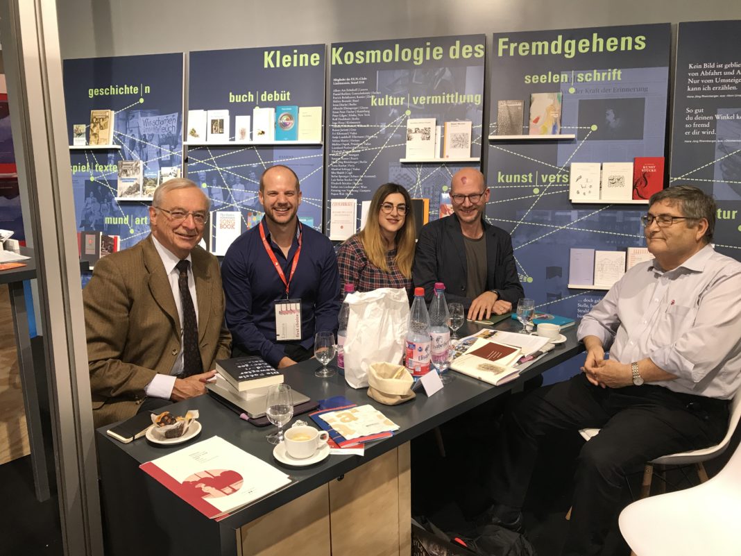 2018 kann die Kulturstiftung wieder ein beachtliches Bücherverzeichnis mit 59 Neuerscheinungen vorlegen. Die Schwerpunktsetzung auf die junge und dynamische Liechtensteiner Literaturszene mit der Ausstellung „Kleine Kosmologie des Fremdgehens“ wurde von Autorinnen und Autoren aus Liechtenstein begleitet: Isabel Wanger mit dem Roman „Am Stammtisch“ und Christiani Wetter mit „Unvermeidbare Dinge“ sind die jüngsten und letzten Veröffentlichungen der verdienstvollen Gedächtnisreihe Ludwig Marxer im van Eck Verlag (gesamthaft 10 Bände), die talentierten Autorinnen und Autoren ein Forum bot. Benita Batliner freute sich, ihr Jugendbuch „Der lange Weg nach Orbadoc“ auf der Messe ausgestellt zu sehen. Maurus Federspiel begleitete seine beim Hollitzer-Verlag in Wien erschienenen Erzählungen „Die Vollendung“ und freute sich über die Präsenz am Liechtensteiner und am österreichischen Stand. Stefan Sprenger konnte sein Lesestück „Die Krötenarie“ frisch gedruckt und gebunden erstmals auf der Buchmesse in die Hand nehmen. Mit der Veröffentlichung im Zürcher Chronos-Verlag konnte das Theaterstück als Lesefassung in Schaaner Dialekt und in standarddeutscher Übertragung von Jens Dittmar einem internationalen Publikum gezeigt werden. Am Donnerstag und Freitagnachmittag standen die Autorinnen und Autoren am Stand in einem regen Austausch mit dem Fachpublikum. Die „Freunde der Frankfurter Buchmesse“ besuchten dreimal mit Sonderführungen den Stand der Kulturstiftung und stellten damit einen Kontakt zu ausgewählten Leserinnen und Lesern her.
