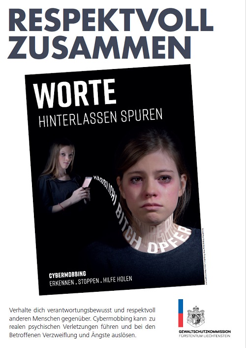 Die Kampagne „Respektvoll zusammen“ arbeitet mit zwei Sujets: „Worte hinterlassen Spuren“ und „Cybermobbing erniedrigt! Stell dich gegen Gruppenzwang“. Damit fordert die Gewaltschutzkommission Kinder und Jugendliche auf, sich verantwortungsbewusst und respektvoll anderen gegenüber zu verhalten und sich gegen diese Art des Mobbings einzusetzen. Denn Cybermobbing kann zu psychischen Verletzungen führen und bei den Betroffenen Verzweiflung und Ängste auslösen.