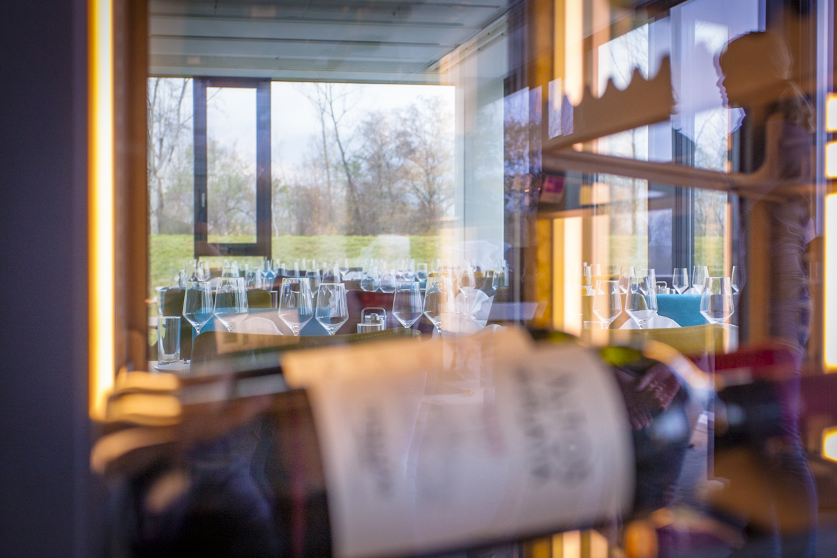 Begleitet von einer bodentiefen Fensterfront, die sich über die ganze Nordseite erstreckt, teilt sich das Restaurant in zwei Teile: den klassischen Essbereich und das Separee. Mit offenen Türen dient es als Lounge-Bereich, doch es kann auch für private Anlässe oder Geschäftsessen gebucht werden. Mit drei (!) Seiten aus Glas und einer Wand aus spanischen Kacheln, den sogenannten Azulejos, welche extra aus Barcelona hergebracht wurden, besticht das Separee durch Einzigartigkeit. Ein freier Blick auf die Alpen und die Liechtensteiner Felder runden das gewisse Etwas ab.