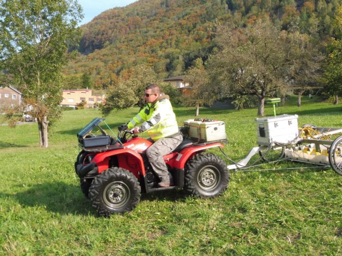 Das Gebiet am Nordrand von Triesen wurde aufgrund der grossen Fläche über das ganze Jahr verteilt in drei Abschnitten gemessen. Die letzte und ausgedehnteste Untersuchung fand im Oktober statt. Dabei kam ein von einem Quad-Bike gezogenes Radarsystem mit sechs Kanälen zur Anwendung, das über GPS genau positioniert wurde.