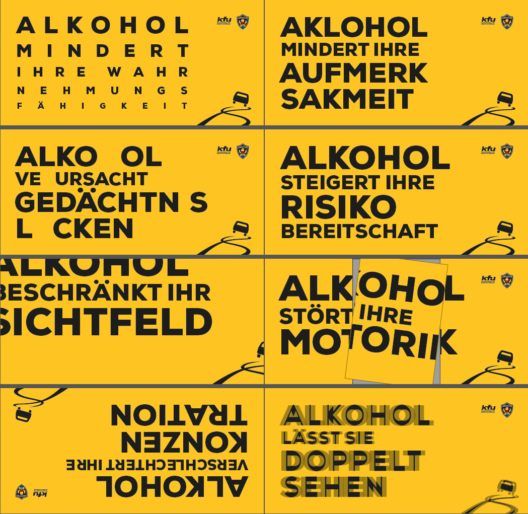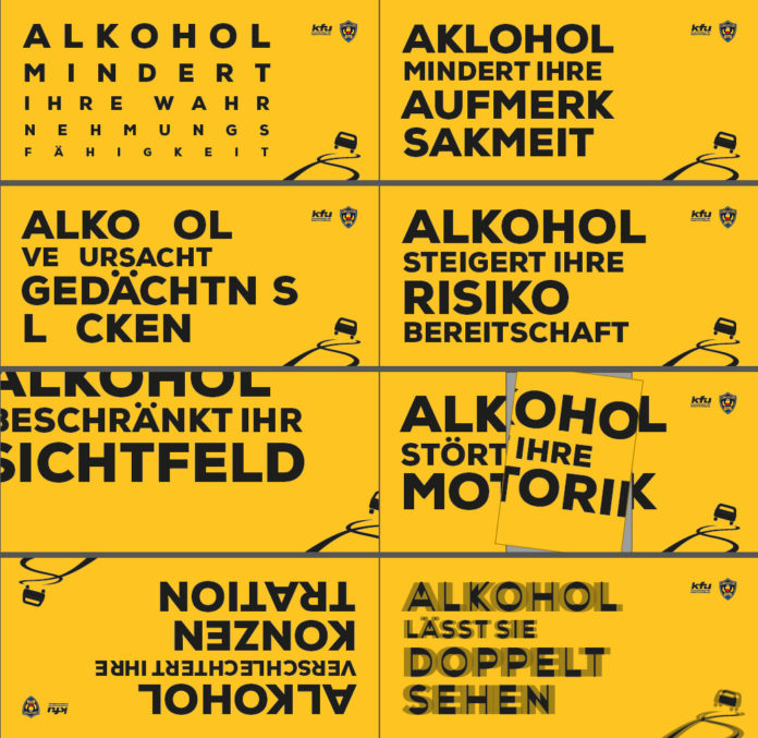Die neu lancierte Kampagne der Landespolizei in Zusammenarbeit mit der Kommission für Unfallverhütung soll aufzeigen, dass Alkohol am Steuer nicht ungefährlich ist. Jedes der acht verschiedenen Sujets zeigt eine mögliche Auswirkung von Alkohol auf – wie er die Wahrnehmungsfähigkeit und die Aufmerksamkeit mindert, Gedächtnislücken verursacht, die Risikobereitschaft steigert, das Sichtfeld einschränkt, die Motorik stört, die Konzentration verschlechtert und Bilder doppelt sehen lässt. Die Landespolizei appelliert an die soziale Verantwortung und die Einsicht der Fahrzeuglenker, nach dem Konsum von Alkohol auf das Lenken eines Fahrzeuges zu verzichten.