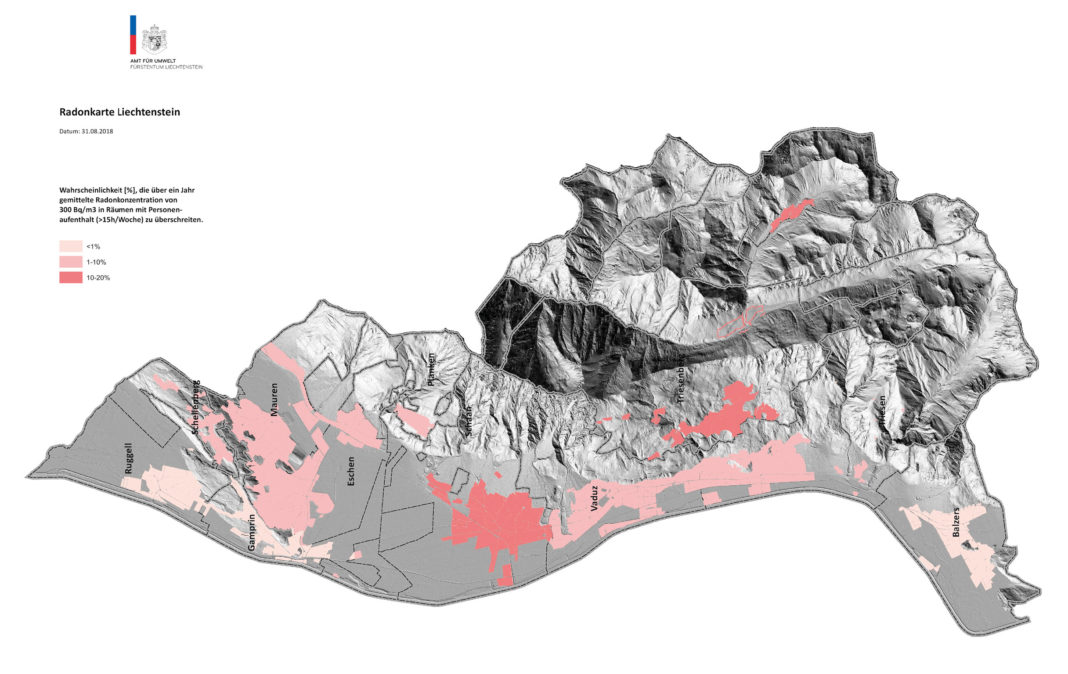 In Liechtenstein werden seit dem Jahr 2000 Radonmessungen in Gebäuden durchgeführt. Auf Basis dieser Messwerte wurde das Gefährdungspotenzial hinsichtlich des neuen Referenzwertes beurteilt und in einer Radonkarte dargestellt. Die Radonkarte zeigt pro Gemeinde die Wahrscheinlichkeit an, den Referenzwert in Räumen mit Personen-aufenthalt zu überschreiten.