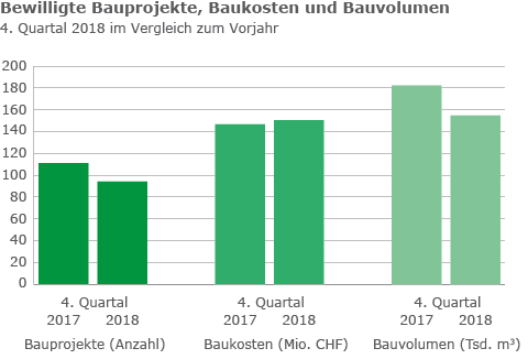 Im 4. Quartal 2018 verringerte sich die Zahl der erteilten Baubewilligungen gegenüber dem Vorjahresquartal von 111 auf 94 Baubewilligungen. Die projektierten Baukosten fielen gegenüber dem Vorjahresquartal leicht höher aus. Die von den Bauherrschaften geplanten Baukosten beliefen sich auf CHF 150.5 Mio., nach CHF 146.7 Mio. im Vorjahresquartal. Zunahmen der Baukosten wurden in den Bereichen Infrastruktur sowie Industrie und Dienstleistungen verzeichnet. Im Bereich Wohnen war eine Abnahme der geplanten Baukosten zu verzeichnen. Die Investitionen nahmen für Neubauprojekte zu, für Veränderungsbauprojekte nahmen sie hingegen ab.