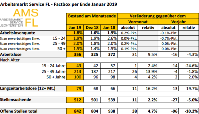 Gemäss den Erhebungen des Arbeitsmarkt Service Liechtenstein (AMS FL) waren Ende Januar 356 Arbeitslose beim AMS FL gemeldet, 31 Personen mehr als im Vormonat. Die Arbeitslosenquote erhöhte sich damit von 1,6 Prozent im Dezember 2018 auf 1,8 Prozent im Berichtsmonat. Gegenüber dem Vorjahresmonat verringerte sich die Arbeitslosigkeit um 16 Personen. Die Arbeitslosenquote sank gegenüber dem Vorjahresmonat um 0,1 Prozentpunkte.