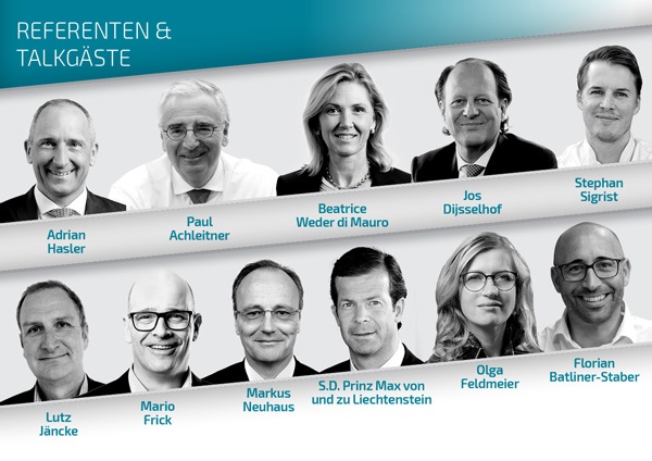 Zu den Speakern gehören Adrian Hasler, Regierungschef des Fürstentums Liechtenstein, Paul Achleitner, Aufsichtsratsvorsitzender der Deutschen Bank, Beatrice Weder di Mauro, Wirtschaftswissenschaftlerin und UBS-Verwaltungsrätin, Jos Dijsselhof, CEO SIX, Stephan Sigrist, Gründer der Denkfabrik W.I.R.E., sowie Hirnforscher Lutz Jäncke. Auf dem Podium diskutieren S.D. Prinz Max von und zu Liechtenstein, CEO LGT Group, Markus Neuhaus, Verwaltungsratspräsident PwC Schweiz/Liechtenstein, und Mario Frick, Verwaltungsratspräsident Bank Frick, gemeinsam mit Paul Achleitner über die Zukunft der Finanzplätze Liechtenstein und Schweiz