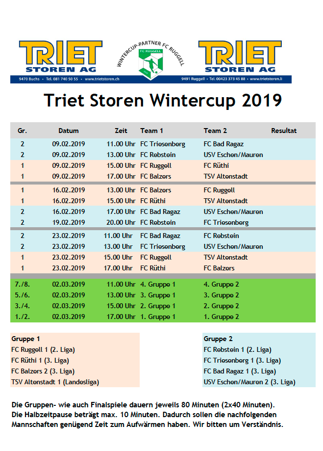 In zwei Vierergruppen werden an den nächsten drei Wochenenden die Finalpaarungen ermittelt, welche am 2. März 2019 ausgespielt werden. Der FC Ruggell freut sich, dass auch dieses Jahr wieder Mannschaften aus Liechtenstein sowie dem angrenzenden St. Galler Rheintal und aus Vorarlberg dem Wintercup das gewisse Flair vermitteln.