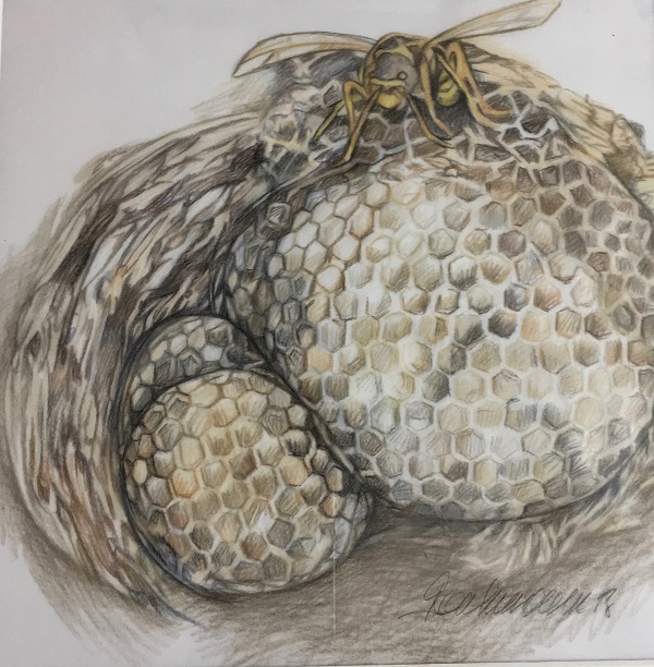 Birgit Bachmann hält sich am liebsten im Atelier auf. Kein Wunder, sind doch ihre filigranen Zeichnungen enorm zeitaufwendig. An einer großformatigen Zeichnung arbeitet sie 180 bis 200 Stunden. Und wenn eine neue Ausstellung ansteht, so wie jetzt bei allerArt, versucht sie auch ganz gezielt auf die Räumlichkeit hinzuarbeiten. So hat sie denn auch für den Raum in der Remise eigens eine neue Serie geschaffen, die aus zehn kleinen Blättern besteht. Motiv dieses Zyklus‘, die den Titel „Homeless“ trägt, sind Wespennester. Auch hier kommt wieder die inhaltliche Dualität zu tragen. Wespen stechen, sind Quälgeister. Aber ihre Nester, die aus morschen, trockenen Holzstückchen, die zu Kügelchen zerkaut werden, errichtet werden, stellen eine Urform eines behaglichen „Wohnens“ dar. Sie stellen somit eine Metapher für die Sehnsüchte der Homeless People dar, zu denen letztlich auch die Migranten zählen.