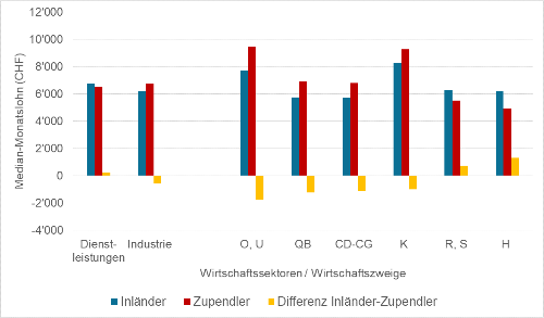 Auch innerhalb der Wirtschaftssektoren sind die Unterschiede gross. Die Bandbreite der Differenz zwischen den Medianlöhnen der Inländer und Zupendler reichte 2016 von +21% bis -22%. Abb. 2 zeigt nebst den Hauptsektoren (Industrie, Dienstleistungen) diejenigen fünf Wirtschaftszweige mit einer Differenz von mehr als 10 Prozentpunkten.
