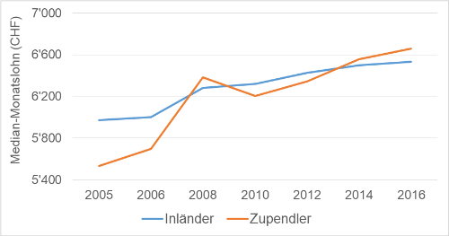 Der liechtensteinische Landtag befasste sich in seiner Februarsitzung mit einer Motion «zur Neuausrichtung der Geburtenzulage». Wir greifen in diesem Newsletter einen Aspekt aus der Landtagsdebatte auf. Ein Parlamentarier stellte fest, dass der Medianlohn der zupendelnden Arbeitnehmenden mittlerweile denjenigen der inländischen Angestellten überholt hat. Auch wenn die Differenz in 2016 bei nur CHF 197 (1.9%) lag, bestätigt die Lohnstatistik diese Feststellung (Abb. 1).
