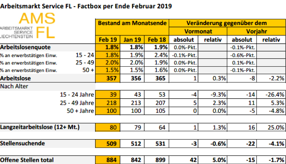 Gemäss den Erhebungen des Arbeitsmarkt Service Liechtenstein (AMS FL) waren Ende Februar 357 Arbeitslose beim AMS FL gemeldet, 1 Person mehr als im Vormonat. Die Arbeitslosenquote bleibt im Februar 2019 mit 1,8 Prozent unverändert gegenüber dem Vormonat. Gegenüber dem Vorjahresmonat verringerte sich die Arbeitslosigkeit um 8 Personen. Die Arbeitslosenquote sank gegenüber dem Vorjahresmonat um 0,1 Prozentpunkte.
