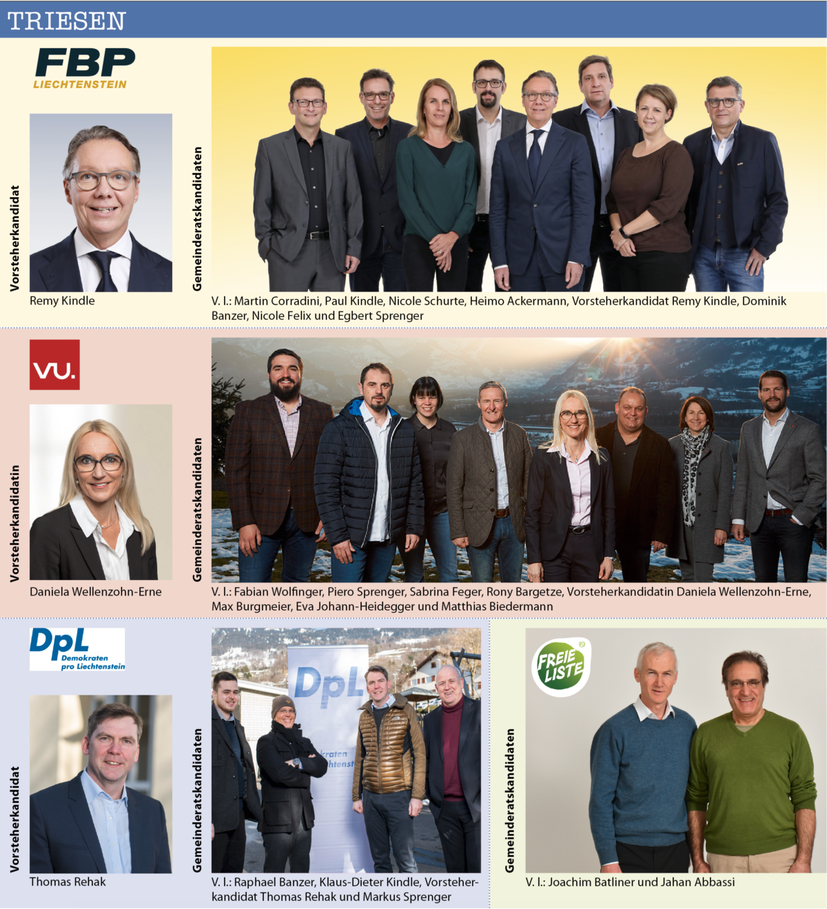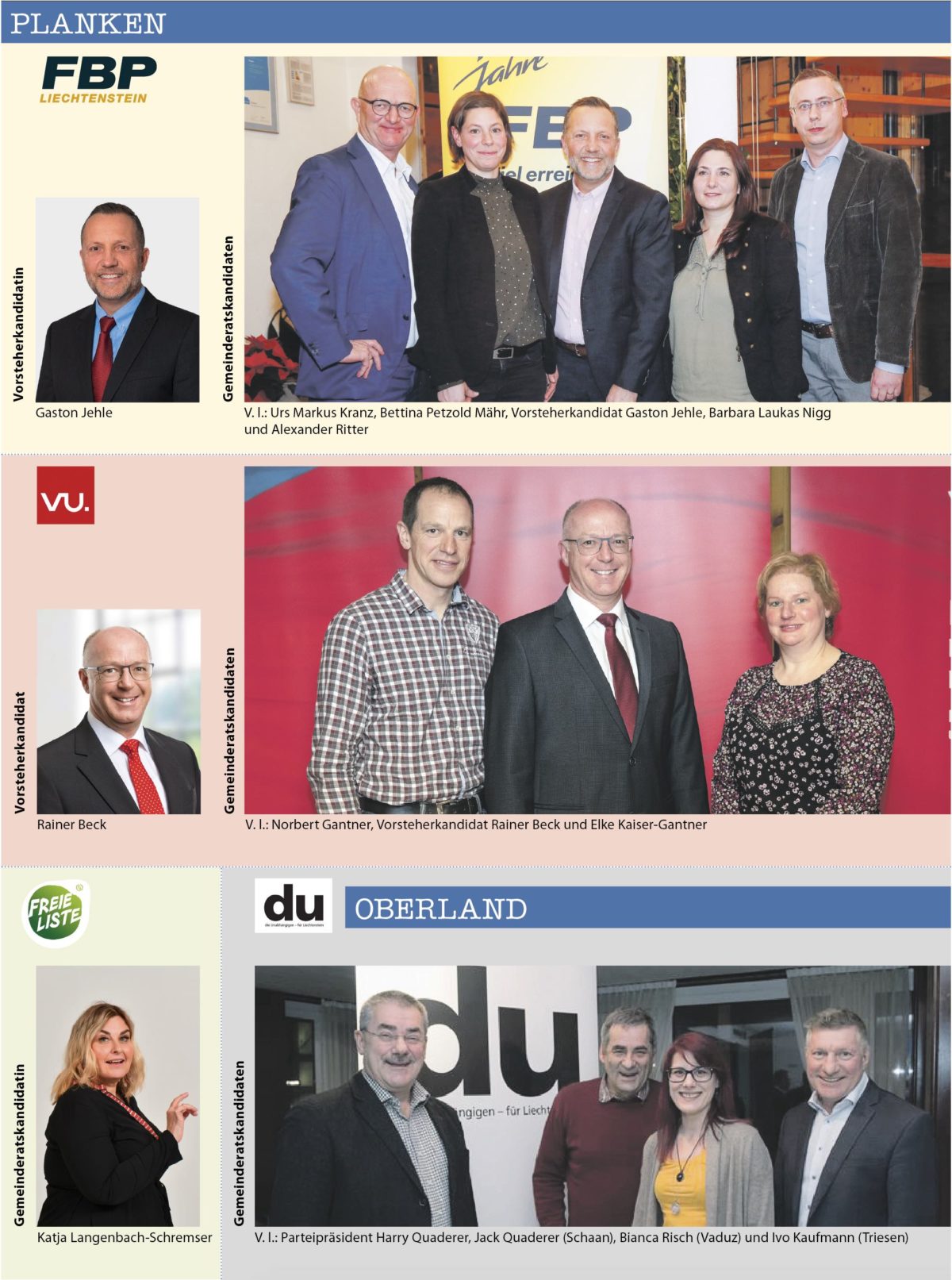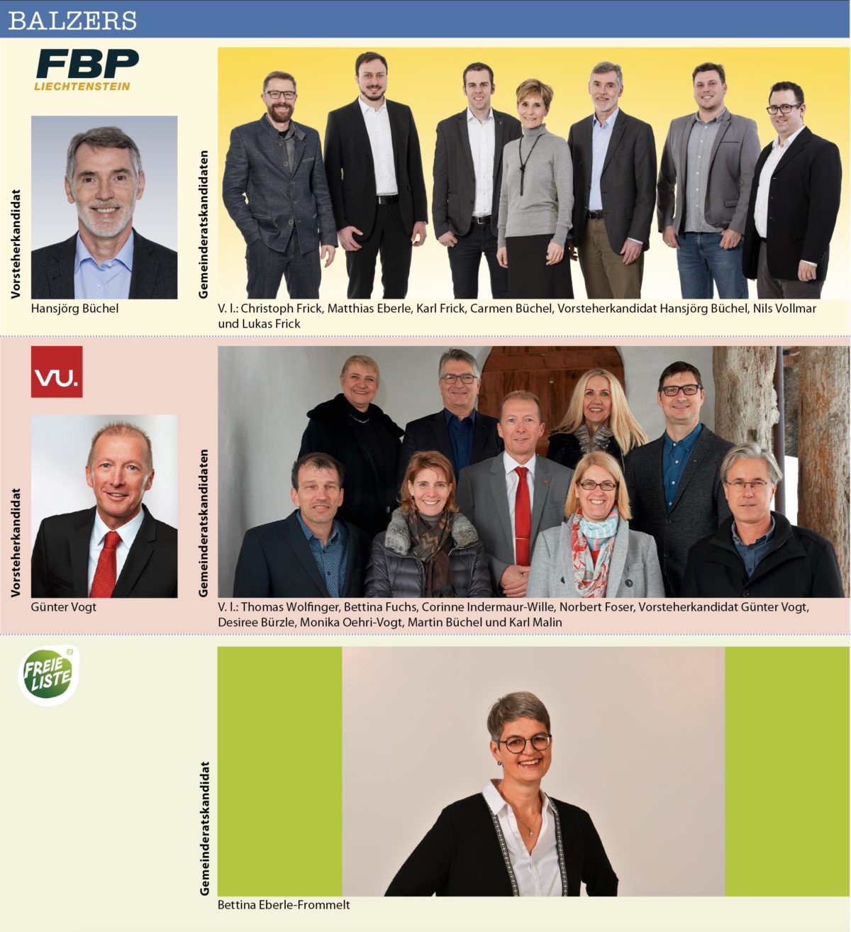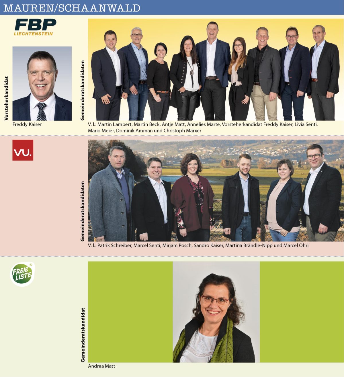 Insgesamt bewerben sich 21 Bürgermeister-resp. Vorsteher-Kandidaten/innen in den elf Gemeinden des Landes. Dabei stehen in sechs der elf Gemeinden die Vorsteher/in bereits fest, weil sie sich keinem Gegenkandidaten stellen müssen. Es betrifft dies: Triesenberg (Christoph Beck), Schaan (Daniel Hilti), Mauren (Freddy Kaiser), Schellenberg (Norman Wohlwend), Ruggell (Maria Kaiser-Eberle) und Gamprin (Johannes Hasler).