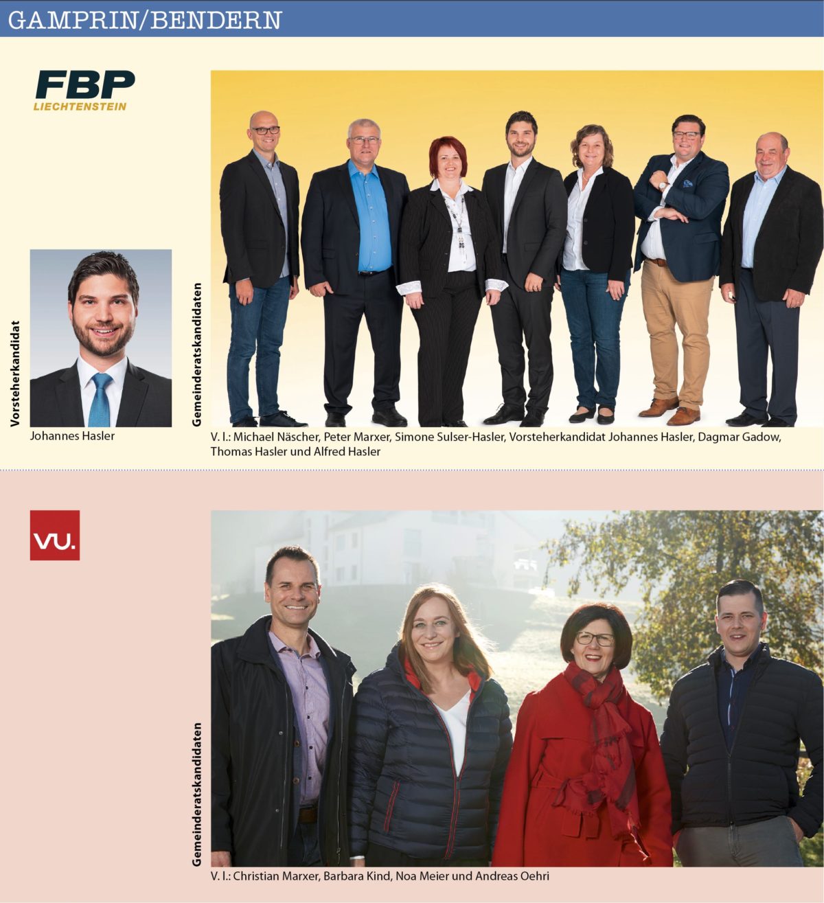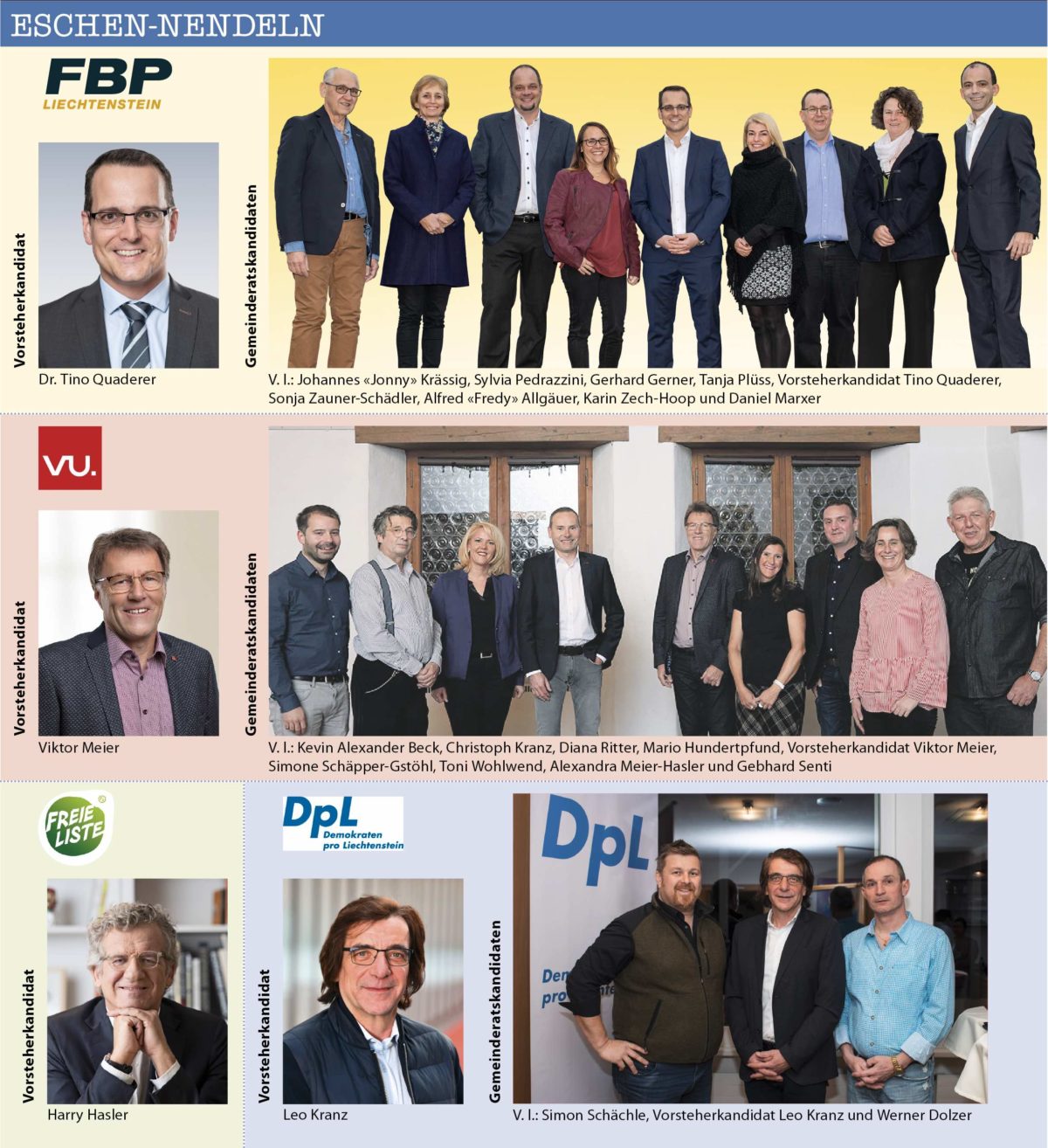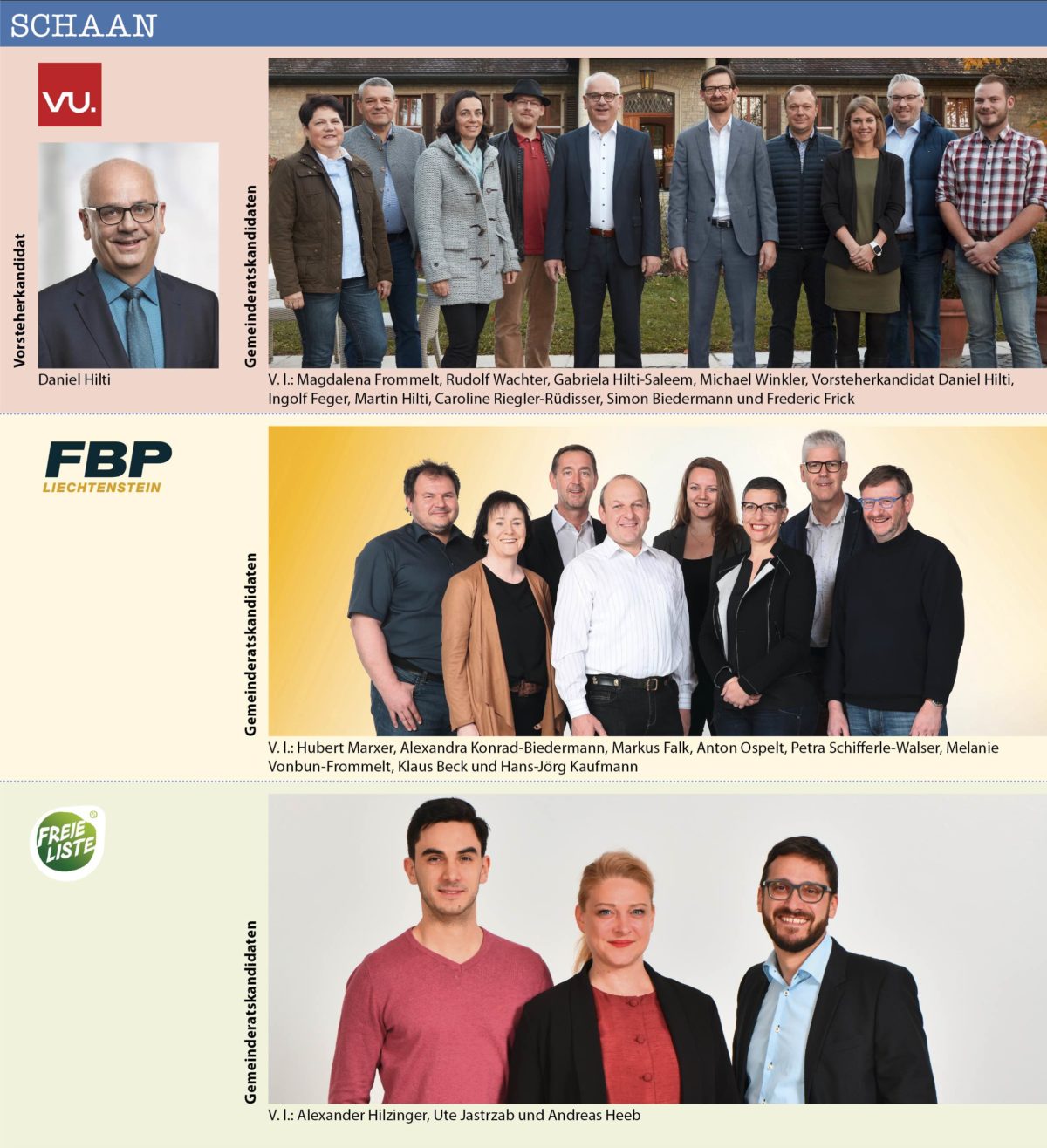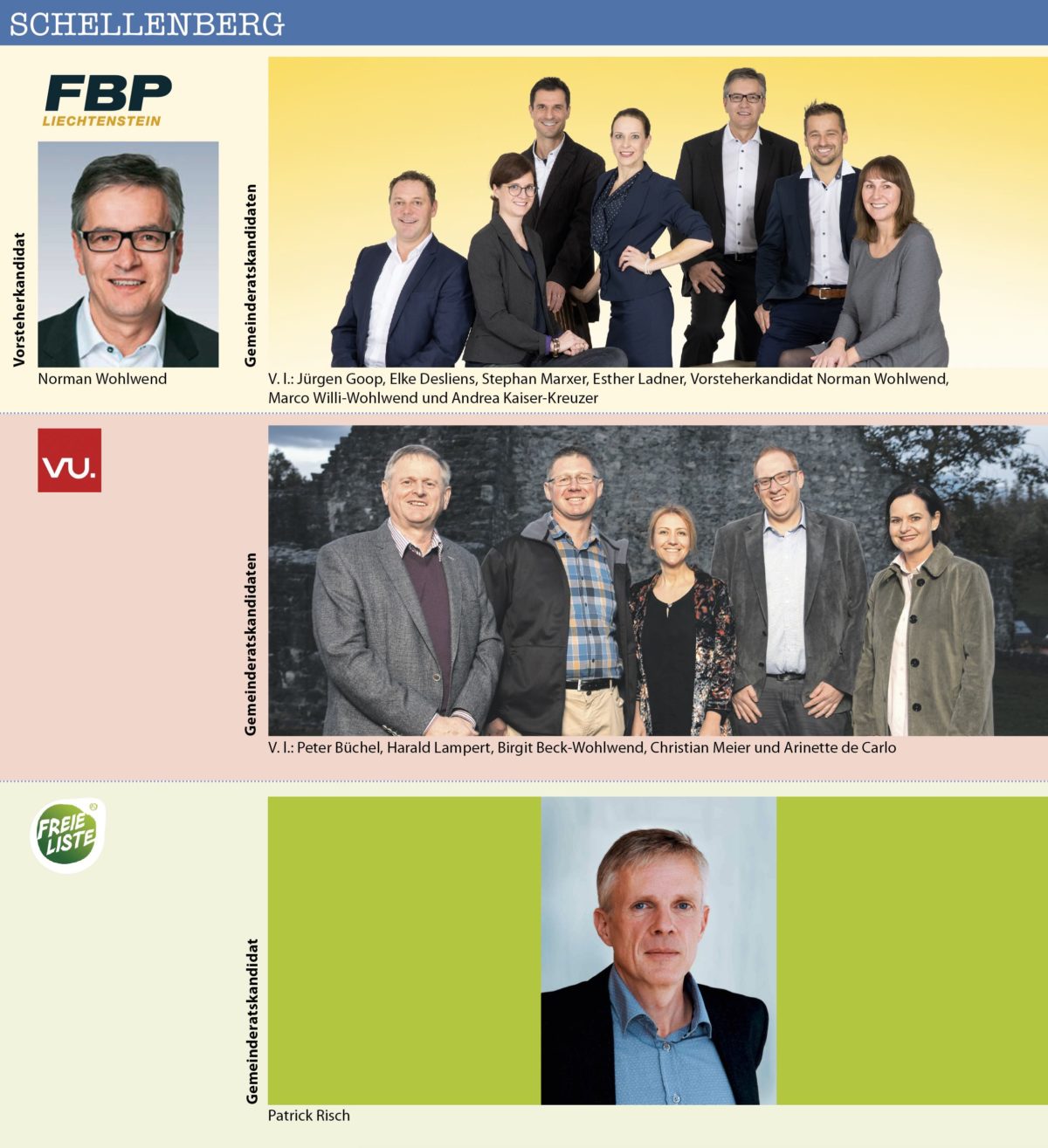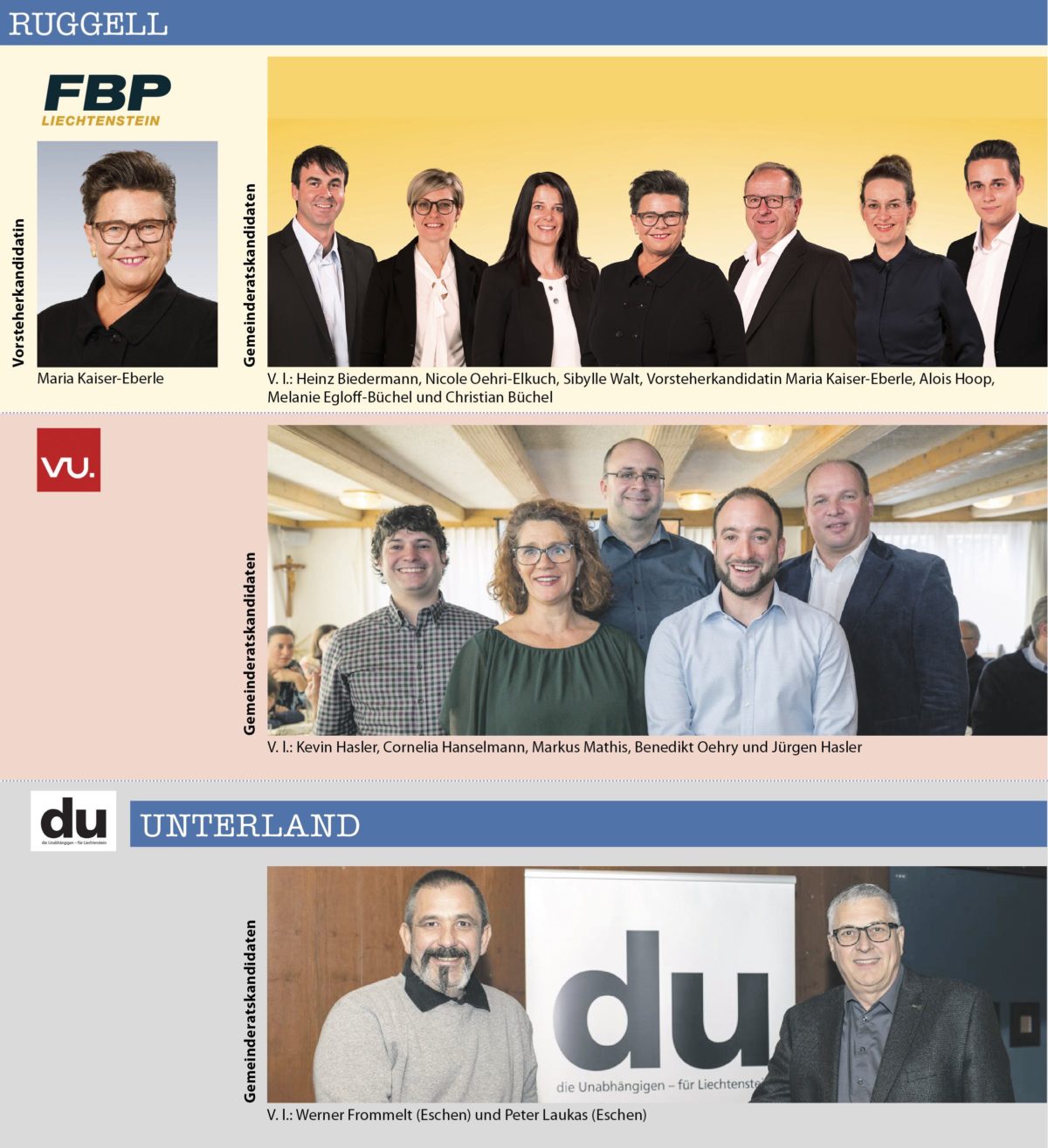Insgesamt bewerben sich 21 Bürgermeister-resp. Vorsteher-Kandidaten/innen in den elf Gemeinden des Landes. Dabei stehen in sechs der elf Gemeinden die Vorsteher/in bereits fest, weil sie sich keinem Gegenkandidaten stellen müssen. Es betrifft dies: Triesenberg (Christoph Beck), Schaan (Daniel Hilti), Mauren (Freddy Kaiser), Schellenberg (Norman Wohlwend), Ruggell (Maria Kaiser-Eberle) und Gamprin (Johannes Hasler).