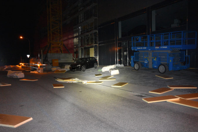 Während der Nacht wurden Baustellentafeln, Abschrankungen und diverse andere Gegenstände durch den Sturm auf die Strassen geweht. Diese wurden durch die Polizeipatrouillen weggeräumt bzw. wieder ordnungsgemäss aufgestellt. Zu grösserem Sachschaden kam es im Industriegebiet in Triesen. Hier wurden durch den Sturm Isolationsplatten vom Dach einer Baustelle geweht und beschädigten in der Umgebung geparkte Fahrzeuge. Die Feuerwehr Triesen wurde aufgeboten, um die Strasse abzusperren und die losen Materialien auf dem Dach zu sichern.