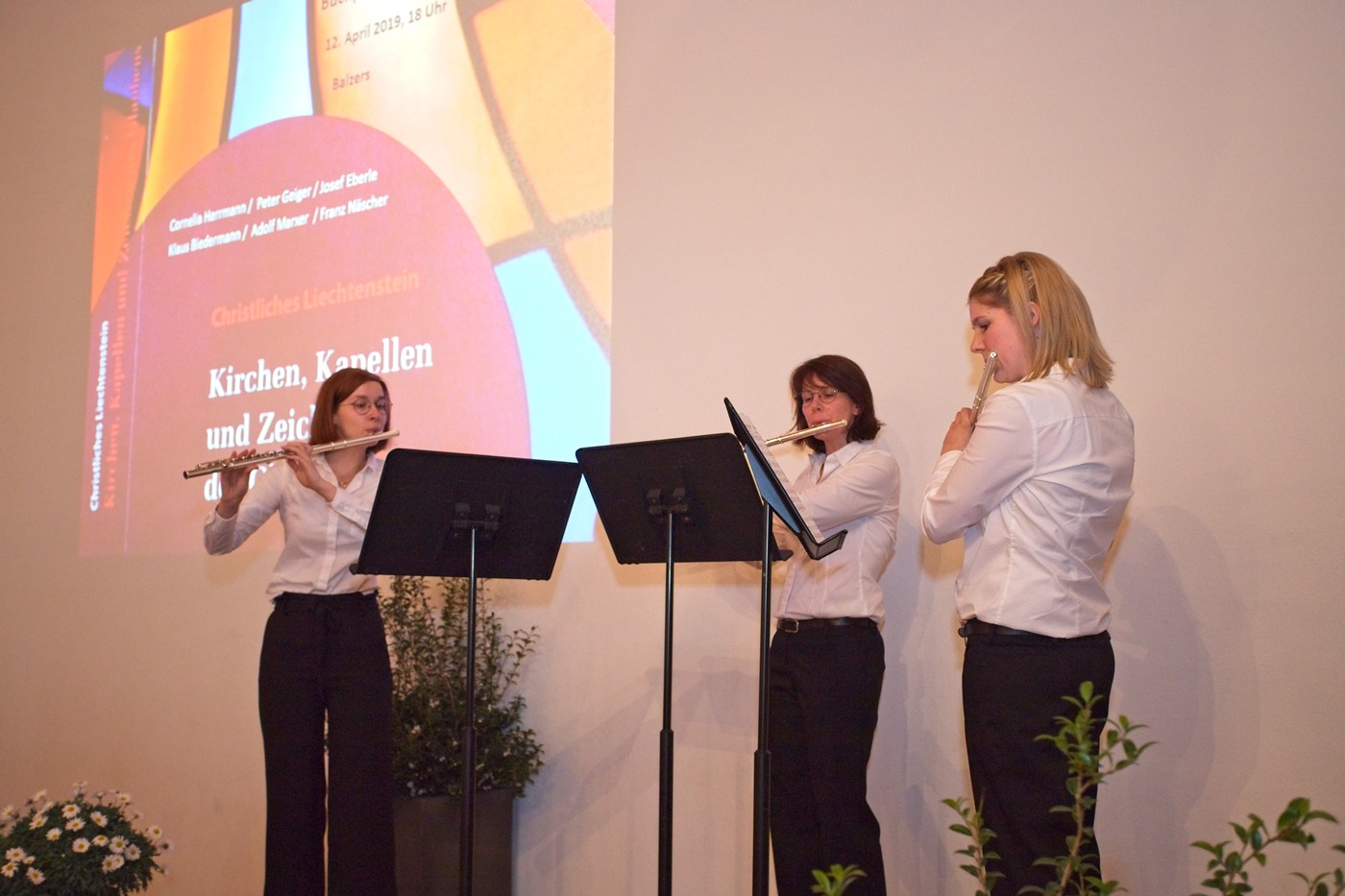 Nach zweijähriger Arbeit hat die Hand in Hand Anstalt Balzers am Freitag, 12. April das von ihr initiierte und finanzierte Kirchenbuch «Christliches Liechtenstein – Kirchen, Kapellen und Zeichen des Glaubens» einer rund 100-köpfigen Besucherzahl präsentiert. Die Harmoniemusik Balzers umrahmte mit einem Flötentrio den Anlass.