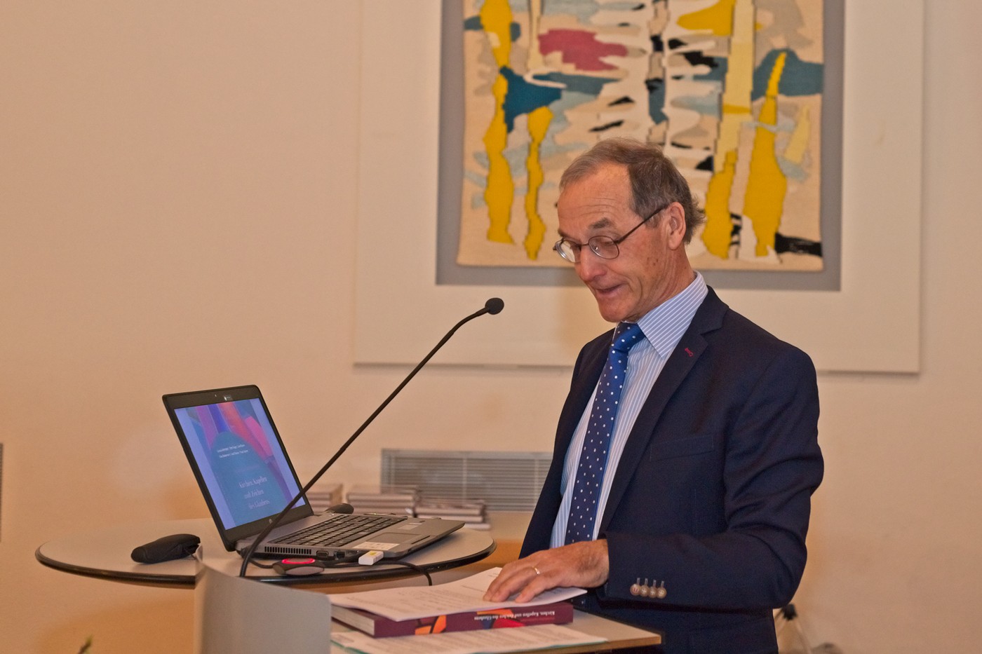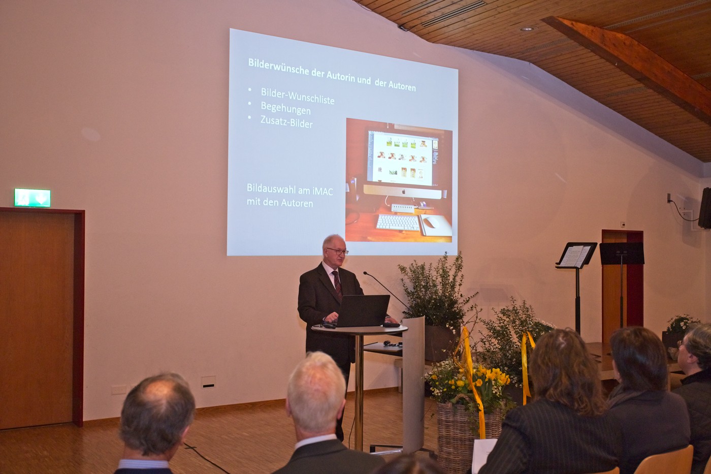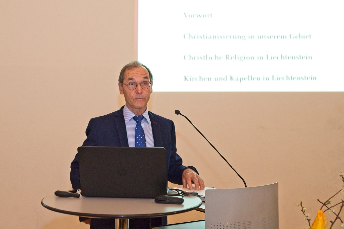 Vom Autorenteam ergriff Dr. Geiger nach der herzlichen Begrüssung von Jacqueline Vogt, der Geschäftsführerin der Hand in Hand Anstalt, das Wort. Er stellte das Buch vor. Es lade ein zum Lesen, Schauen, vor Ort besichtigen. Es sei aber auch ein schönes, gehaltvolles Geschenk. Es werden alle Kirchen und Kapellen in Liechtenstein beschrieben, d.h. die Historikerin Dr. Cornelia Herrmann hat diejenigen von Balzers, Schaan, Planken, Eschen/Nendeln, Schellenberg und Ruggell beschrieben; Peter Geiger diejenigen von Triesen, Gamprin-Bendern, Mauren-Schaanwald und des Klosters Schellenberg, Klaus Biedermann diejenigen von Vaduz und Josef Eberle die Kirchen und Kapellen im Berggebiet. Zudem stammen die herrlichen Bilder aus seiner Hand.