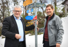 Donath Oehri, Vorsteher von Gamprin-Bendern und Martin Knöpfel, Projektleiter des Liechtenstein- Wegs bei Liechtenstein Marketing, haben am 5. April den ersten Wegweiser für den...