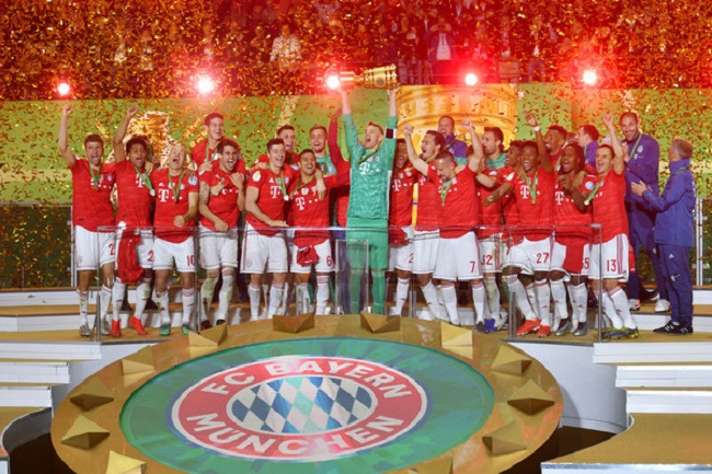 Die siegreichen Münchner nach dem gewonnen Pokalfinale in Berlin. Kapitän Manuel Neuer hebt den Pokal in die Höhe. Foto: Picture Alliance, Frankfurt/Main