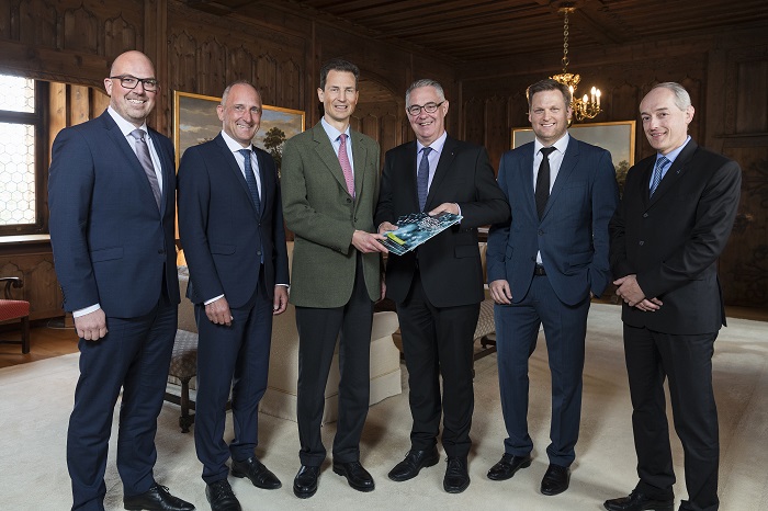 Auf Schloss Vaduz haben Vertreter der Standortinitiative die digitale Roadmap an Erbprinz Alois von und zu Liechtenstein, Regierungschef Adrian Hasler und Regierungschef-Stellvertreter Daniel Risch übergeben. Dabei erklärt Erbprinz Alois von und zu Liechtenstein: „Die Digitalisierung berührt sämtliche Lebensbereiche und dementsprechend ist es entscheidend, dass alle Beteiligten an einem Strang ziehen, um Liechtenstein auf diesem Weg weiter voranzubringen. Aus diesem Grund habe ich mich gerne dazu bereit erklärt, das Patronat über die Initiative digital-liechtenstein.li zu übernehmen. “