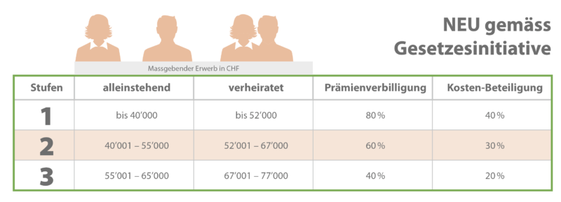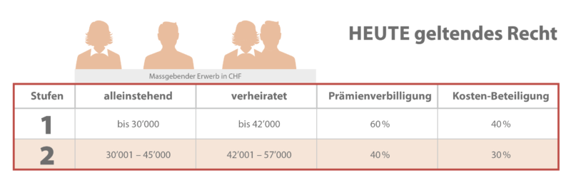 - Auch Versicherte bzw. betroffene Personen mit einem Erwerb ab 55’001 bis 65’000 Franken, die bisher die vollen Prämien zahlen, erhalten nun einen Anspruch auf 40 % Prämienverbilligung.