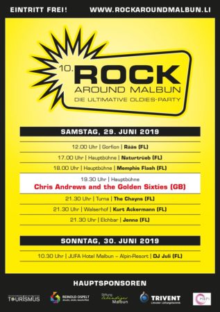 Die Oldies-Party Rock around Malbun findet – bei freiem Eintritt – am Samstag, 29. Juni und am Sonntag, 30. Juni statt. Es treten ausschliesslich Musikgruppen aus Liechtenstein auf: