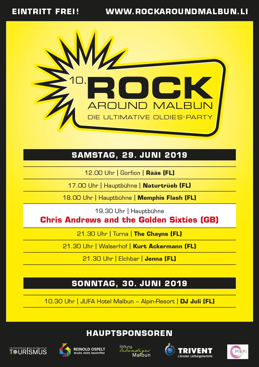 Die Oldies-Party Rock around Malbun findet – bei freiem Eintritt – am Samstag, 29. Juni und am Sonntag, 30. Juni statt. Es treten ausschliesslich Musikgruppen aus Liechtenstein auf: